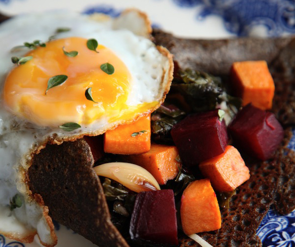 In Brittany, crêpes ”galettes”are usually folded into a rough square around your filling of choice. Gruyere and ham are definitely crowd pleasers, especially when an egg is cooked in the center of the dish. I prefer roasted root vegetables, with garlic and caramelized shallots on a bed of wilted kale and Gruyère cheese. Finished with a sunny-side up egg, it’s a cold weather meal that’s hard to beat in terms of color, flavor, and satisfaction.