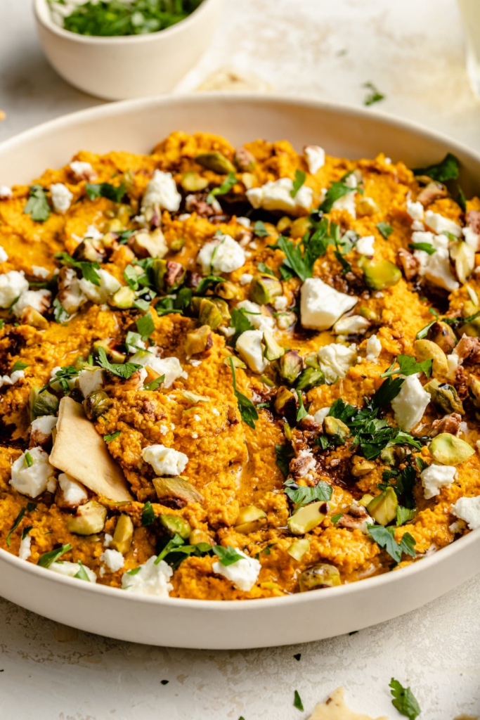Preheat the oven to 400ºF. Chop carrots into 1-inch pieces (no need to be too precise since we’re blending them later!) Add the carrots and whole garlic cloves to a large sheet pan. Drizzle with 1 T. olive oil and season with salt and pepper. Toss everything together with your hands, then roast for 30 minutes or until the carrots are tender and golden brown on the edges. Add roasted carrots and garlic to a food processor with tahini, lemon juice, cinnamon, turmeric, cumin, salt, pepper, pistachios and water. Process until mostly smooth, scraping down the sides with a spatula halfway through. Taste and adjust seasonings if needed. Spoon carrot dip into a shallow bowl and use the spoon to create shallow divots on the surface for the toppings. Drizzle with olive oil and garnish with crumbled feta, chopped pistachios, parsley and a drizzle of honey.