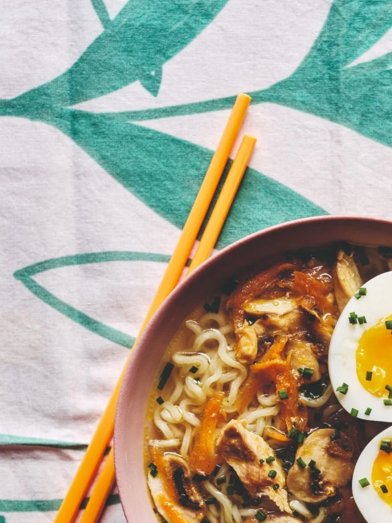 Heat the oil in a large, deep-sided frying pan over a medium heat, then add the garlic and ginger and cook, stirring, for 2 minutes, until soft and fragrant. Add the sliced chicken to the pan and cook, stirring continuously, for 2-3 minutes, until well-sealed and coated in the garlic and ginger. Add the mushrooms, carrot and soy sauce to the pan and cook for a further 2 minutes, until the veg are just starting to soften. If you’re cooking now… Dissolve the stock cubes in 8 cups (2 litres) of boiling water, then add to the pan along with the chives and the dried noodles. Bring to the boil, then reduce the heat to a gentle simmer and leave to cook for 6 minutes. Meanwhile, if you are serving the ramen with boiled eggs, bring a separate pan of water to the boil and cook the eggs for 7 minutes, then immediately drain and rinse under cold running water to stop the eggs from cooking further (this should give you eggs that are firm enough to peel, with yolks that are still slightly soft and jammy). Peel the eggs and cut into halves. Divide the noodles, veg and broth between 4 serving bowls, then add half a boiled egg to each bowl. Serve hot. If you’re making ahead to freeze… Remove the pan from the heat and set aside until the vegetables have cooled to room temperature, then divide the mixture equally between 4 small, labelled freezer bags. Grate half a stock cube into each bag along with 1 block of dried noodles and half a tablespoon of chives, then seal and freeze flat for up to 3 months. Then