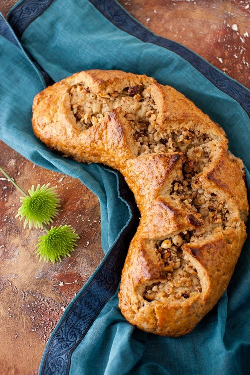 While the dough chills, make the hazelnut filling; Whisk together the egg whites, yolk, sugar, and bitter almond. Stir in the chopped toasted hazelnuts. After the dough has chilled, sprinkle 1 to 2 tablespoons of flour onto your work surface, to prevent the dough from sticking. Roll the dough out to form a large rectangle, about 2 feet long and 1 foot wide. Remember to scrape underneath the dough, and flip it over a few times; sprinkle a little flour on the surface each time you do this, again to keep the dough from sticking. Spread the filling evenly over the dough, to about 1/2 inch from the edges. Roll the long side of the dough over itself, using a knife to scrape under the dough if it is sticking. Roll all of the dough to form a long log. Carefully transfer the log to the baking sheet, forming it into a half circle. Fold each end of the dough over itself, pressing it together to close. Using a knife, cut a zigzag along the top of the roll. Whisk together the egg yolk and teaspoon of milk; lightly brush this over the top of the roll. Bake for 40 to 45 minutes, until the roll is crispy and dark golden brown on top. Serve warm or cooled to room temperature.