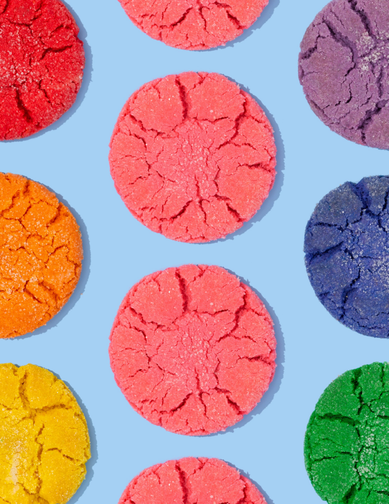 In a large bowl, whisk together the flour, baking soda, baking powder, and salt. Set aside. In the bowl of a stand mixer fitted with a paddle attachment beat together the shortening, white granulated sugar, and vanilla extract for 2 full minutes on medium speed, until light and fluffy. Add the eggs, one at a time, then turn the mixer to low and gradually add the flour mixture, one C. at a time, until it’s all fully combined. At this point divide the dough into as many colors as you want, then add food coloring and mix with your hands or the stand mixer. Once the dough is dyed, wrap it in plastic and set it in the fridge to rest for an hour. While the dough is resting, preheat the oven to 350ºF and line a couple baking sheets with parchment paper. When the dough has rested scoop out 1/4 C. size balls of dough (I just use a standard ice cream scoop) and roll them into a smooth ball before rolling in the cane sugar. Place 5 balls of dough on a baking sheet and flatten slightly with the back of a measuring cup, sprinkle a bit more sugar on each cookie then bake for 12-14 minutes one sheet at a time until the cookies have spread out and cracked but haven’t browned at all. Remove the baking sheets from the oven and let the cookies cool for 5 minutes before transferring to a cooling rack to cool completely. Repeat the process with the rest of the dough until all the cookies are baked.
