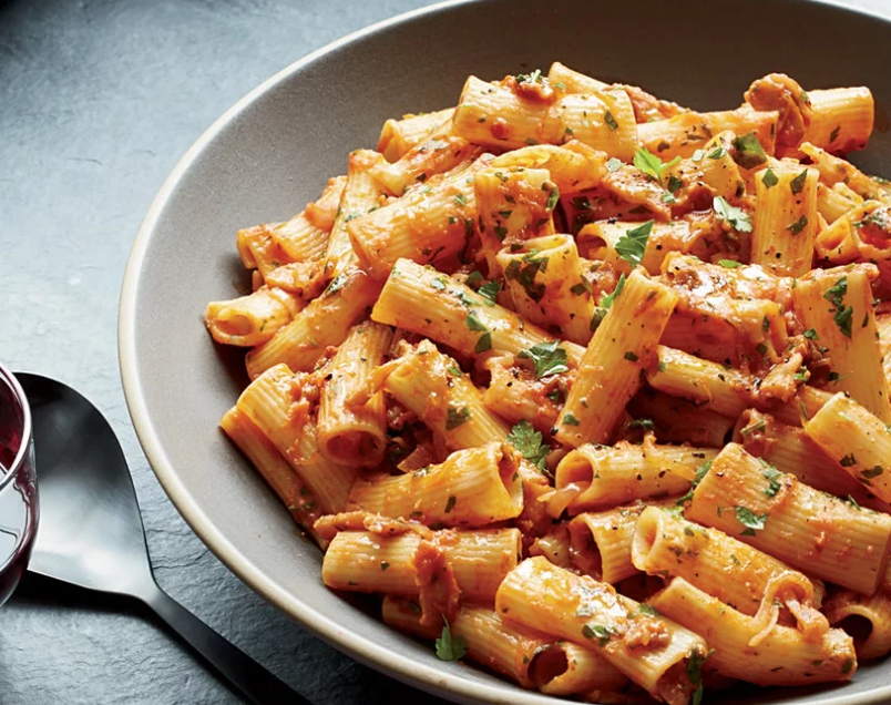 Using the sauté function, heat the oil and pancetta in the pressure cooker pot. Cook, stirring frequently, until the pancetta is browned and crisp and the fat has rendered, about 5 minutes. Stir in the onion and cook until soft, 3 to 4 minutes. Stir in the garlic, red pepper flakes, and black pepper and cook for 1 minute. Use your hands to crush the whole tomatoes directly into the pot. Make sure to add all the juices from the can. Use a spatula to scrape up the browned bits on the bottom of the pot. Taste the sauce at this point and add salt to taste. Stir in the pasta and 1/2 C. water. Lock the lid into place and cook on high pressure for 6 minutes. Manually release the pressure. Stir in the pecorino. If the pasta is too al dente, cover the pot with the lid (but don’t lock it on), and let it sit for 5 minutes; the pasta mil cook a little more in the residual heat of the pot. Otherwise, serve immediately, with more pecorino, olive oil, and black pepper on top.