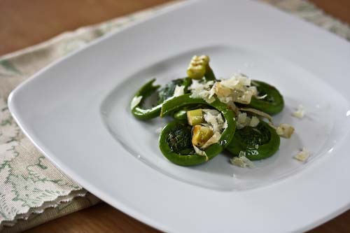 To prep your fiddleheads, cut the touch stems off, including any brown parts. Run them under cold water in a colander, then place them in a bowl of water and swirl around. Dry them on paper towels. Heat the olive oil in the pan over medium heat. Add the garlic and sauté until fragrant, about 2 minutes. Add the scallions and the fiddleheads, cover, and cook for 4 minutes. Uncover, stir, and continue to cook for another 4 minutes. Remove from heat and sprinkle with salt and pepper to taste. Squirt the juice of half a lemon on top. Spoon onto plates and serve with a grating of parmesan cheese over the top.