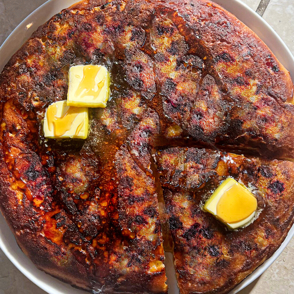 Heat oven to 375 degrees. In a large bowl, whisk together flour, sugar, baking powder, baking soda, and salt. In another large bowl, whisk together buttermilk, eggs, and 2 T. of melted butter. Fold in dry ingredients and then add cranberry sauce into the batter. Don’t over-mix—you want the batter to look marbled. Heat remaining ½ T. of butter. Oil in a 10-inch oven-safe skillet over medium-high heat. Add batter to the pan and spread to the edges. Cook just until the edges are set, 5-7 minutes. Transfer the skillet to the oven and bake for 10-15 minutes until the pancake is golden and puffed on top. Place a serving plate over the skillet and carefully invert the pan to release the pancake. Cut the pancake into wedges and serve with butter and maple syrup.