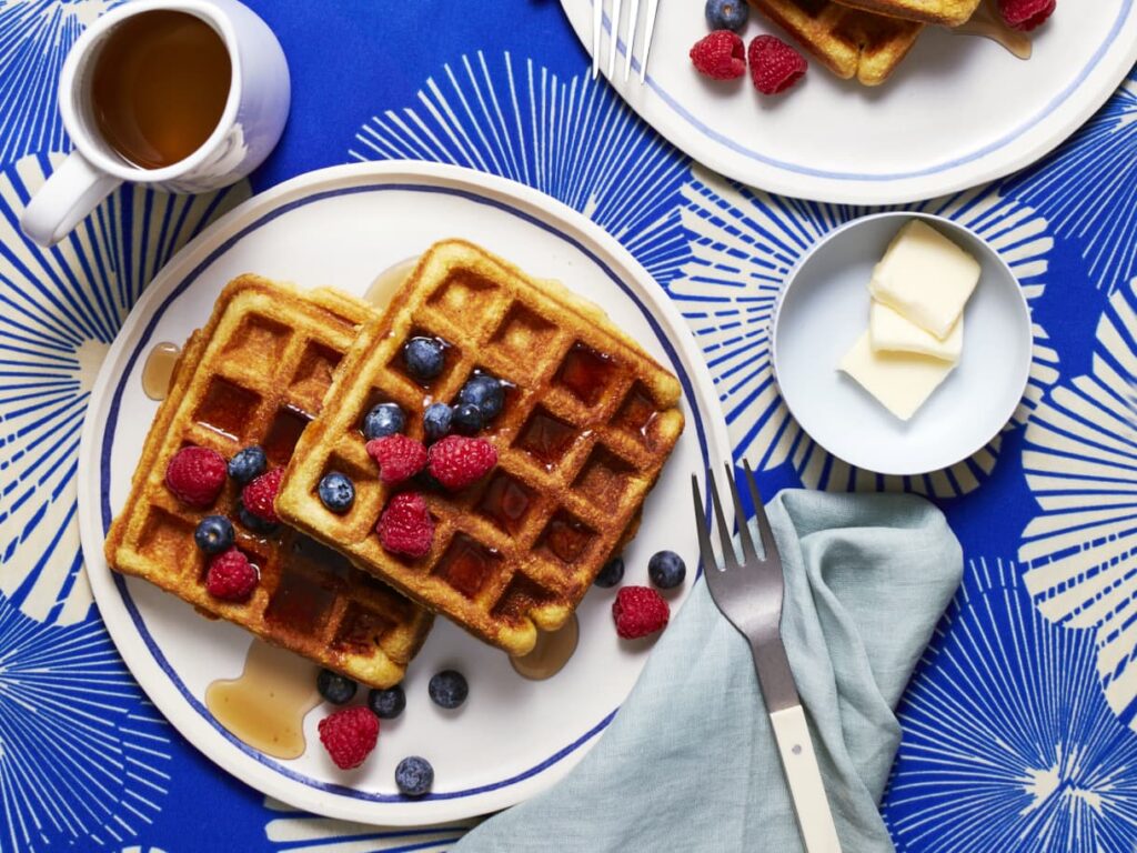 Cut 1 stick unsalted butter into a few pieces, place in a small microwave-safe bowl, and microwave on high until melted, 40 to 60 seconds. (Alternatively, melt on the stovetop over low heat.) Set aside to cool slightly while you heat a waffle iron for medium heat. Place the melted butter, 1 1/4 cups all-purpose flour, 3/4 cup finely ground yellow cornmeal, 1/2 cup whole buttermilk, 2 large eggs, 2 tablespoons packed light brown sugar, 2 teaspoons vanilla extract, 2 teaspoons baking soda, 1 teaspoon baking powder, and 3/4 teaspoon kosher salt in a large bowl and whisk until combined; the batter will be quite thick. When the waffle iron is ready, coat with cooking spray, then pour in the amount of batter recommended by the manufacturer, about 1/2 cup for a (7-inch) thin round waffle. Close the lid and cook until the waffle is golden-brown. When the waffle is ready, remove from the iron to a wire rack. If not serving immediately as they are made, place directly on a rack in a 200 F oven to keep warm. Repeat making waffles with the remaining batter. Serve with fresh berries. Recipe notes: The waffles can be refrigerated in an airtight container for up to five days or frozen for up to two months. Reheat directly on a rack in a 350 F oven until heated through, 4 to 6 minutes if refrigerated, or 10 to 12 minutes if frozen.
