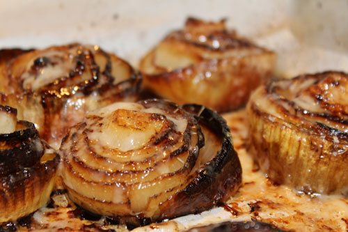 Lightly oil or spray dutch oven. Trim about 1/4 inch off top and bottom of onions so that halves sit flat on a plate. Cut onions in half crosswise and then peel them. Arrange onion halves, cut sides up in prepared oven. Brush tops of onions with olive oil; sprinkle with salt and pepper. Cover and bake at 400 degrees for 30 minutes. Mix beef broth with soy sauce. Pour over onions. Bake for 30 minutes more or until onions are brown and tender. Sprinkle sage and cheese evenly over onions; cover and bake for 5 minutes or until cheese melts. Makes 4 servings.