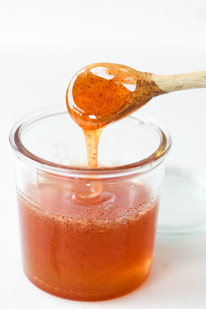 Put honey and hot pepper flakes in a glass microwave safe jar. Microwave for 1 minute and stir to combine (the honey will become thinner and more fluid after it is heated.) We don’t want the honey boil, as this will destroy some of its beneficial properties. Stir and let the honey steep for 15 minutes. Strain into a clean jar. Note: if your honey has cooled and thickened too much to be strained, gently heat it again to loosen it for straining. Honey will keep in an airtight jar in a cool dry place. Once you infuse honey with dried chile flakes I recommend using it within a 3-6 months. If you use fresh hot chiles you’ll want to store the strained honey in the refrigerator to reduce the risk of spoilage. When refrigerated, the hot honey should last for about 3-6 months.