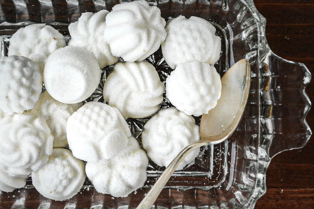For the plain sugar cubes, put the sugar into the bowl of a small food processor and add the water. Process until the sugar is uniformly moist, this will just take about 30 seconds. For the lemon sugar, put the sugar into your processor. Add the lemon rind and process until the rind is completely incorporated into the sugar and it is a pale yellow. I give the small machine a little shake now and then to redistribute everything. You don’t need the water for this one because the rind adds the moisture. For the rose sugar cubes, process the sugar with the rose water. Spoon the moist sugar into plastic molds and press in firmly. Use the pads of your fingers to really make sure you’ve packed it in. The processor will have ‘fluffed up’ the sugar which is why you need to pack it down. To invert the mold you can either do it directly onto a flat surface like your counter top, or you can place something firm and flat over the mold, and invert the mold and the surface together, Gently lift the mold so you don’t disturb the delicate impressions. Let them sit for at least 30 minutes, or up to an hour. They will be firm enough to handle and even stack, carefully. Plain sugar cubes will last indefinitely. Flavored sugar cubes should be used asap. Check the post for further details, photos, and tips. Notes: If you are having trouble with your sugar cubes not holding together when you un-mold them you can increase the moisture by a small amount. Make sure you have packed them into the mold firmly.