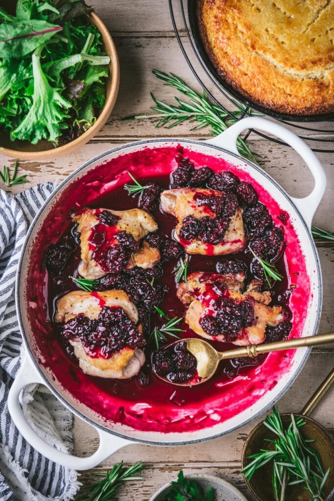 In a small bowl, stir together the blackberries and brown sugar; set aside. Heat a large skillet over medium-high heat. Add 1 tablespoon of the oil to the pan and swirl it around to coat. Pat chicken dry; season with salt and pepper to taste. Add the chicken to the pan; cook for about 7 minutes per side, or until cooked through and golden brown. The meat should reach an internal temperature of 165°F. Remove the chicken from the skillet; set aside on a plate. Cover with foil to keep warm. Do not clean out the skillet; add another 1 tablespoon of oil. Add the onion and rosemary; cook and stir for 1 minute. Add the blackberries and brown sugar, vinegar, lemon juice, mustard, and ¼ teaspoon kosher salt; cook for 10-12 minutes, or until the blackberries soften and the sauce starts to thicken. Scrape the browned bits from the bottom of the pan as you stir the sauce frequently. Return the chicken to the skillet; heat just until warm, spooning the sauce over the meat. Taste and season with additional salt and pepper, if necessary.