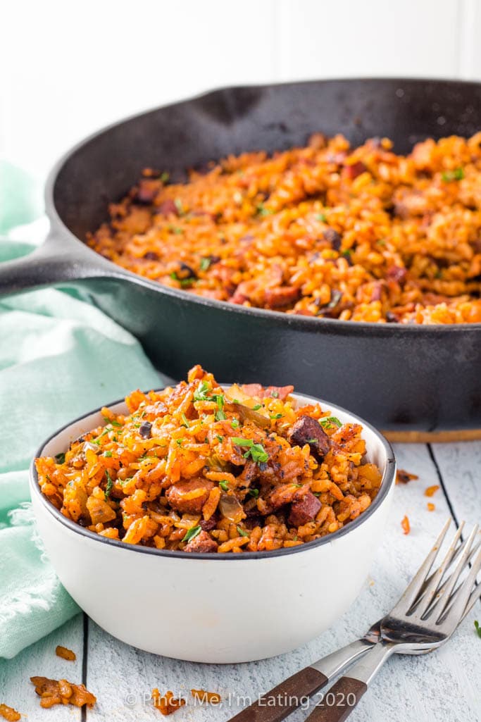 Preheat the oven to 350°F. Prep the rice: Rinse the rice until the water runs clear. I like to place the rice into a large bowl, fill with cool water, and then gently swish the rice around. Careful not to aggressively handle the rice to not break the rice grains. Drain the water and repeat this process about 6 times to remove as much surface starch as possible. Then drain all water and set the rinsed rice aside until called for in the recipe, below. Add the chopped bacon into a large, deep skillet over medium heat. Cook the bacon, stirring often, until crisp. Then use a slotted utensil to remove the bacon and set aside. There should be plenty of rendered bacon drippings left in the skillet. Add the onion, celery, and bell pepper into the same skillet. Sauté the trinity mixture, stirring every so often until tender and golden, about 4-5 minutes. Then add in the garlic and continue cooking until the garlic is fragrant, about 1 minute. Add the sausage into the pan and cook with the aromatics until the sausage is golden brown, stirring often, about 2-3 minutes. Then add the tomato paste and stir into the sausage/veggie mixture to coat. Continue cooking for another 1-2 minutes to meld. Pour in the tomato sauce and season the mixture with the brown sugar and Creole Cajun seasoning, stirring to combine. Add the reserved bacon back into the pan along with the rinsed rice directly into the same skillet, stirring to coat with the tomato mixture. Let the rice toast up in the tomato mixture for 3-4 minutes, stirring often. Then pour in the broth and stir everything to combine. Remove the skillet from heat and tent the skillet with foil. Place the skillet onto a large baking sheet and then transfer the entire skillet into the oven. *If your skillet is not oven-safe, simply empty the rice contents into a greased 9×13-inch baking dish and tent with foil. Bake the dish for 30 minutes. Then remove the foil and continue baking for another 15 minutes until the rice is tender. Remove the rice dish from the oven and let the rice sit, undisturbed, for at least 10 minutes. Afterwards, use a fork to fluff the rice. Taste the rice and season with more Creole Cajun seasoning to preference, if needed. Serve Gullah red rice immediately with a garnish of chopped parsley/scallions, if desired, as-is or alongside your favorite main entree. Enjoy!