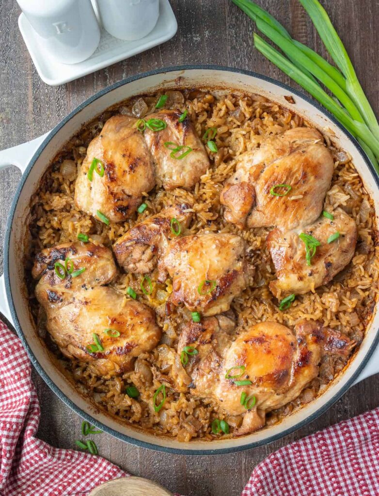 In a large bowl add the soy sauce, brown sugar, rice wine vinegar, pepper and ginger and mix until combined. Add the chicken thigh into the marinade and give it a toss. Place it in the refrigerator for 1 hour or for best flavor 12 hours. Preheat the oven to 400 degrees. Heat a large 12 inch skillet on medium high heat and add the olive oil. Remove the chicken thighs from the marinade but don’t discard the remaining marinade. Place the chicken thighs into the skillet and cook 2-3 minutes, flip and cook another 2-3 minutes. Remove to a plate and set aside, the chicken will not be cooked through at this point. Add the diced onion to the skillet and cook 2-3 minutes just to soften a bit. Add in the jasmine rice and garlic and cook another minute. Pour in the chicken broth and remaining marinade into the rice and bring to a simmer, turn off the heat and place the chicken thighs on top of the rice, cover and bake for 30 minutes. Serve with yum yum sauce drizzled on top.