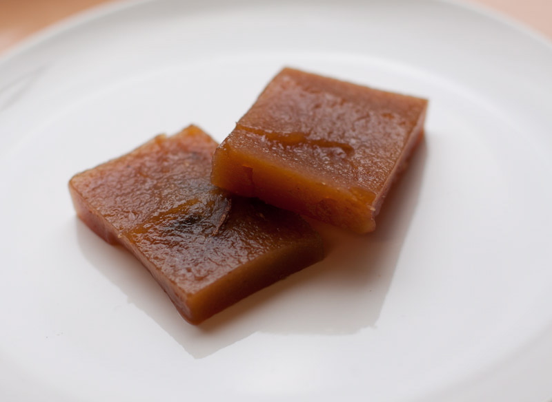 Start with the pulp (the waste) from making crabapple jelly. Press the pulp through a mesh sieve until you’ve got about all that will go through and you’re left with just skins and seeds in the sieve. Discard the skins and seeds and keep the puree. Add a bit of the juice from the crabapple jelly – the strained juice before the sugar is added. Measure the puree and juice. Put the puree, an equal amount of sugar and a bit of lemon juice (about 1 T. per 2 cups puree) in a saucepan. Bring to a boil, then lower to a simmer and cook, covered about 1 to 1 1/2 hours, until it’s really thick and has darkened a bit. Line a small square or rectangle dish with parchment or wax paper. Pour the paste into the dish. Cover loosely with a tea towel and put in the fridge for 2-3 days, until the paste has dried and firmed up. You should be able to lift the block of paste out of the dish using the parchment paper and have it keep its shape. Wrap tightly in plastic wrap and store in the fridge. Should keep at least a month in the fridge Serve with cheese.