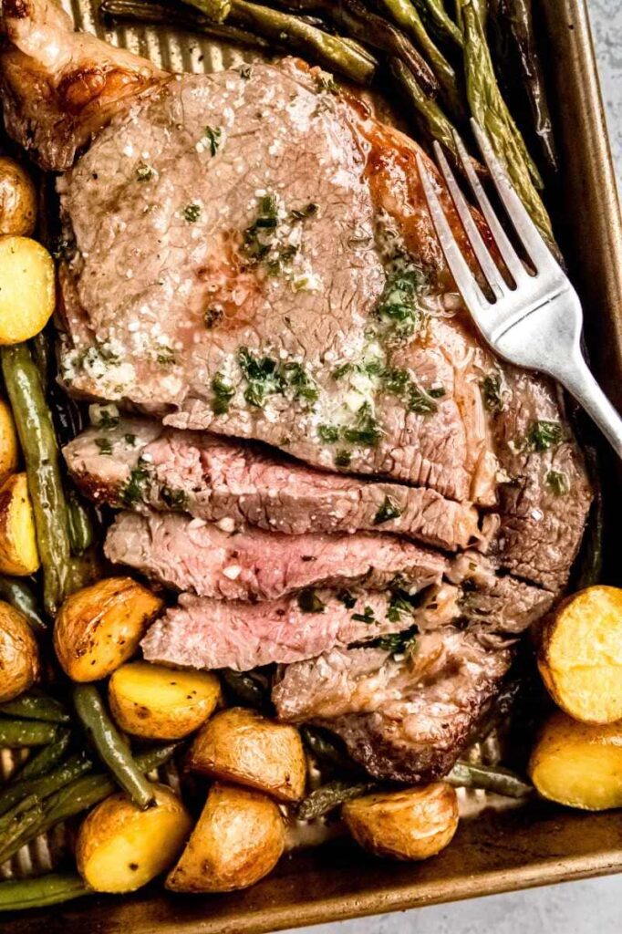 Preheat oven to 375°F and grease a large baking sheet. If you haven’t already, move 2 large ribeye or sirloin steaks to the counter to allow them to come to room temperature. Place 1 pound baby yellow potatoes and 1 pound fresh green beans on the baking sheet, and toss with 2 T. avocado oil. In a small bowl, combine the 1 tsp. garlic powder, ½ tsp. onion powder, ¼ tsp. salt, and ¼ tsp. black pepper. Reserve 1 tsp. of the mixture, then sprinkle the remaining seasoning over the top of the vegetables. Roast the vegetables in the oven for 25 minutes. Remove from the oven and turn and stir the vegetables on the pan. Push the vegetables (carefully) to one side of the baking sheet to make room for the steaks. While the vegetables cook, combine all garlic butter ingredients in a small bowl and set aside. Place the steaks on the baking sheet and sprinkle them with the 1 tsp. reserved seasoning. Broil for 3-4 minutes, then remove from the oven. Cover the vegetable portion of the sheet pan with aluminum foil, flip the steaks, and broil for another 3-4 minutes. Remove the baking sheet from the oven and spread the garlic butter over the steaks. Carefully cover the baking sheet with aluminum foil and allow to rest for about 10 minutes. Serve! This yields medium-rare steaks. Add 2 more minutes of broil time for medium steaks. Bringing the steaks to room temperature is essential to making sure they are tender when baked in the oven. Do not put cold steaks into the oven! You can use sirloin steaks or ribeye steaks for this recipe. The ribeyes are much more tender, but the sirloin steaks are a more budget-friendly option and turn out pretty tender and juicy.