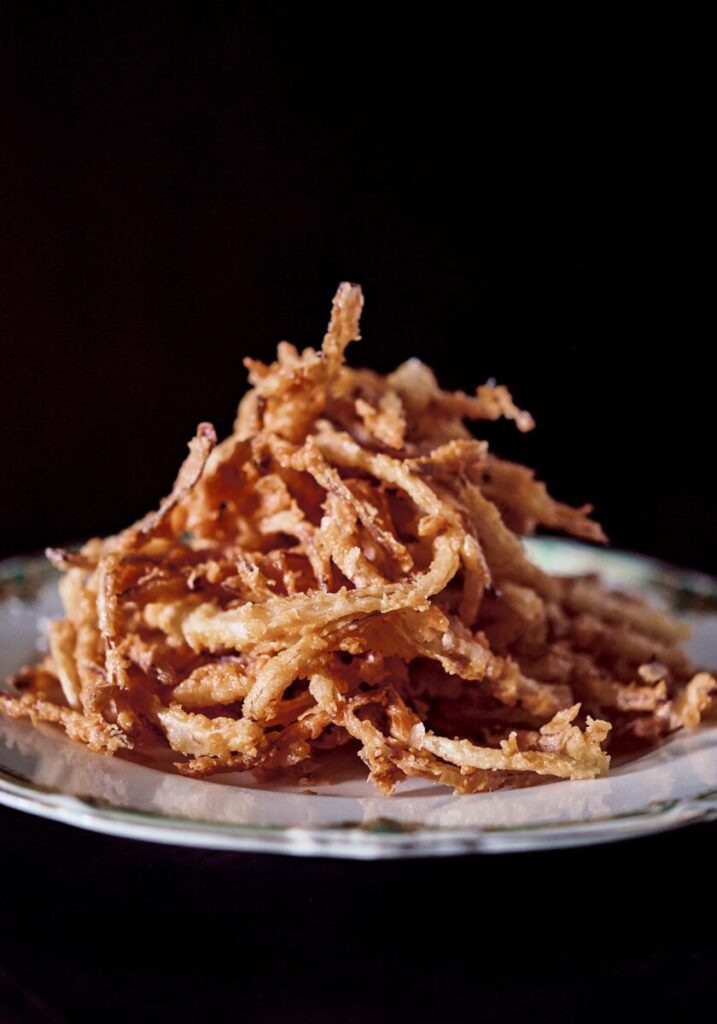 Cut each onion in half through the center (not from end to end). Peel the onions. Using a very sharp knife, slice them about ⅛-inch thick or use a Japanese mandoline to thinly slice them. You want the onion slices to be long and a consistent size. Place the sliced onions in a container and cover them with the buttermilk and hot sauce, then weigh down the onions with a plate to submerge them and let marinate in the refrigerator for 6 to 8 hours or up to overnight. Prepare a tabletop fryer with oil and heat to 350°F. Alternatively, fill a large heavy-bottomed pot with 4 inches of oil and heat the oil over medium-high heat to 350°F. Remove the onions from the refrigerator. In a large colander fitted with a bowl underneath it, strain the onions and reserve the buttermilk for double dredging. In a medium bowl, mix together the flour, cornstarch, 1 tsp. of the salt, the black pepper, and the cayenne. Now it’s time to double-batter the onion rings. Place half the onions in the flour mixture and dredge well. Put the dredged rings aside on a lightly floured sheet pan. Repeat with the rest of the onions. Now dredge the onions again, first in the reserved buttermilk and then again in the flour, and return them to the floured sheet pan. Be sure that all the onions have taken on enough flour. If you see some spots where flour has flaked off, pass the onion back through the flour mixture, really patting the flour onto the onion. Working in small batches, add the onions to the hot oil and fry until browned and crispy, 4 to 5 minutes. Use the fryer onion basket or a spider to transfer the fried onions to a bowl. Immediately toss with the remaining ½ tsp. salt. Let the oil come back to temperature before you add another batch. Consume immediately.