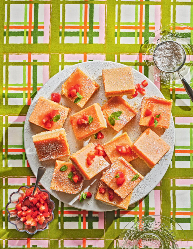 Preheat oven to 325°F. Spray the bottom and sides of a 9-by-13-inch pan lightly with cooking spray. Take a sheet of parchment paper longer than the pan and press it lengthwise onto the bottom. Crumpling the paper and smoothing it out before fitting it into the pan can help. There should be enough parchment hanging over the edges to easily lift the dessert from the pan. Make the crust: Using a stand mixer or a medium bowl and a hand mixer, cream the butter and sugar together until fluffy. Add flour and salt, and mix just until the dough comes together. Scoop the mixture into the pan and gently press it into an even layer. (A little flour on your fingers helps.) Bake for 25 to 30 minutes, just until it turns golden brown. Set the crust aside to cool. Reduce oven to 300°F. Make the filling: Combine lemon juice, zest, strawberries, and sugar in a blender and blend until smooth. Add an egg, blend until smooth, then repeat with each egg, making sure each is incorporated before you add the next. Add flour, baking powder, and salt, and blend until smooth. Pour the filling onto the shortbread crust and bake for about 40 minutes or until the center of the filling is set. Cool completely, then chill in the refrigerator for at least 4 hours. To serve: Use the parchment to lift the dessert onto a cutting board. Using a sharp knife (and a ruler if you really want to be precise), cut into 12 or 24 squares and arrange the bars on a platter. Dust with confectioners’ sugar. Toss chopped berries in a small amount of sugar. Garnish each bar with chopped berries and mint leaves.