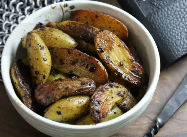Combine the ingredients for the spice blend together in a separate dish and set aside. Prepare and measure your other ingredients and slice the potatoes in half lengthwise. Add the potatoes, malt vinegar, a pinch of kosher salt, and half of the butter to the skillet and cover with cold water. Set the skillet over a medium-high flame and set a timer for 20-25 minutes. Raise the heat to high and boil another 15-20 minutes until the pan is almost dry except for a butterfat sheen. Reduce the heat to medium and flip the potatoes so that they are cut-side down on the skillet. Cook for 5 minutes, then start transferring the deep golden brown potato halves to a mixing bowl. Cover the bowl with foil in between batches to keep the contents warm. Once the skillet is empty, add the remaining butter to the pan. Once melted, stir in three tsp. of the spice blend and the dried chives. Then stir in the potatoes to coat and remove immediately. Dust the finished potatoes with kosher or sea salt before serving. This recipe makes enough spice blend for two batches, so reserve and store the remaining spices for another time.