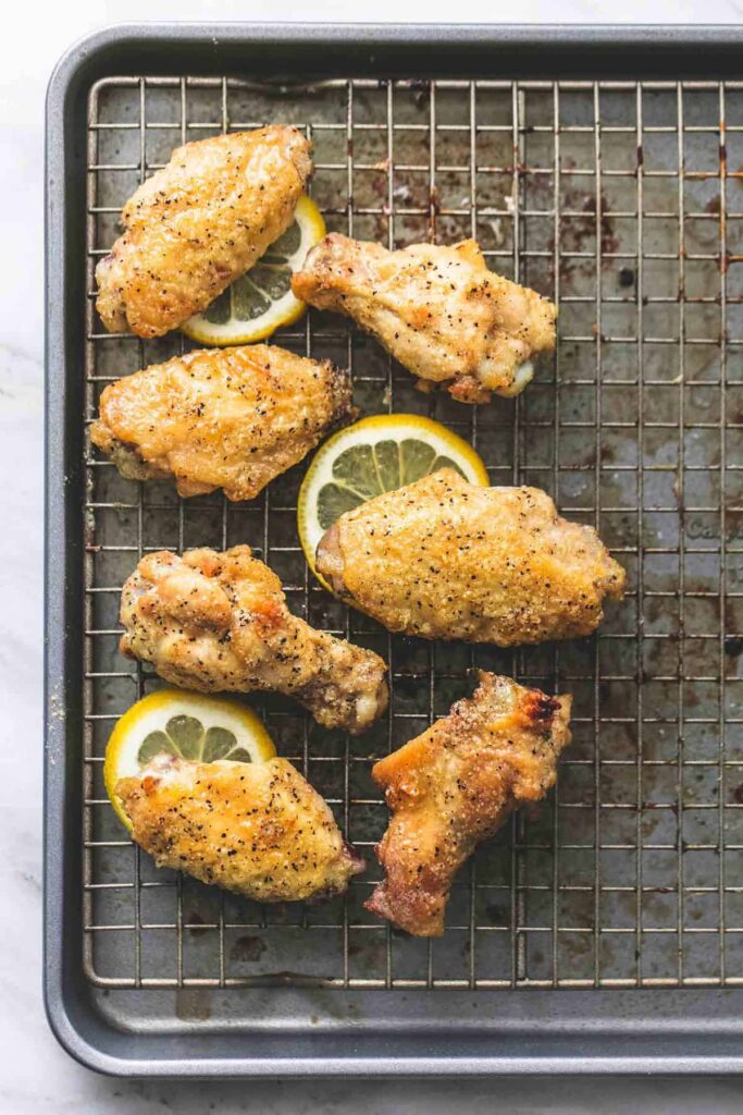 Preheat oven to 425 degrees. Line a baking sheet with foil and place a cooling rack on top of the foil. Arrange chicken wings in a single layer (not touching) and brush with olive oil on both sides. Season generously with salt and pepper on both sides. Bake for 25-35 minutes until crispy. Whisk together butter, honey, cracked black pepper, and lemon juice. Brush onto chicken wings. Serve immediately.