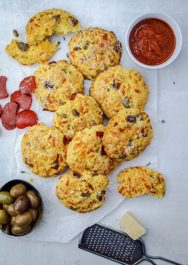 Preheat oven to 400 degrees. In a large bowl mix together cornbread or corn muffin mix, shredded cheese, Italian seasoning, and milk. After the batter is mixed gently fold in quartered olives and pepperoni. Using a large spoon or ice cream scoop drop batter onto a baking sheet lined with parchment paper. Brush biscuits with melted butter and sprinkle with sea salt. Bake for 12-15 minutes until golden brown. Serve with marinara sauce!