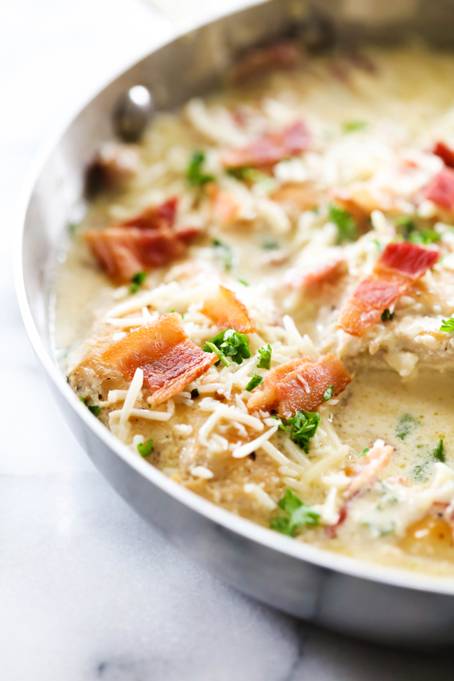 Pound the chicken until it is fairly flat and there are not any thicker portions. Salt and pepper the chicken. Heat a large skillet to medium high heat and oil. Place chicken in skillet and cook on each side for about 5 minutes. Check to make sure it is cooked through completely. Remove chicken from skillet. Wipe skillet to remove any residue. Melt butter over medium heat. Add garlic, cream, pepper, and salt. Bring to a low boil and reduce heat to medium low and simmer for 6 minutes. Remove from heat and slowly add cheese. Return to stove on low and add bacon and cook for 2 to 3 minutes, stirring constantly. Add chicken back in and serve. Sprinkle with Parmesan Cheese and parsley
