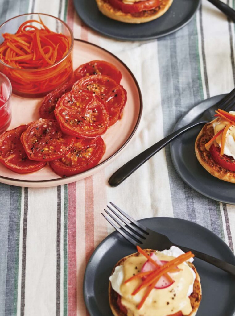 Bring rhubarb, 3/4 C. of the sugar and half of the split vanilla bean to boil, stirring, in medium saucepan. Reduce heat to medium and cook, stirring occasionally, 15 minutes or until rhubarb softens. Transfer to bowl. Remove vanilla bean half. With small knife, scrape out seeds. Stir seeds and strawberries into rhubarb mixture. Refrigerate, stirring occasionally, until cold. Meanwhile, combine yolks, remaining 1/3 C. sugar, remaining half of vanilla bean and 1/4 C. water in large stainless-steel bowl. Place bowl over large saucepan with 1 inch of gently simmering water. Cook mixture, stirring constantly, 8 to 10 minutes or until thickened. Remove bowl from water and whisk until cool. Remove vanilla bean half; scrape out seeds into egg yolk mixture and whisk in mascarpone. Gently fold in whipped cream. Arrange half the ladyfingers in bottom of a 1-1/2- to 2-quart serving dish. Spread with half the fruit mixture. Cover with half the cream mixture. Repeat layering, ending with cream mixture. Garnish with whole strawberries, if desired.