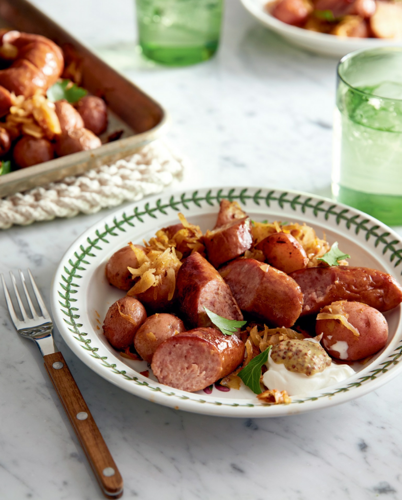 Sheet Pan Snappy Kielbasa with Sauerkraut and Potatoes