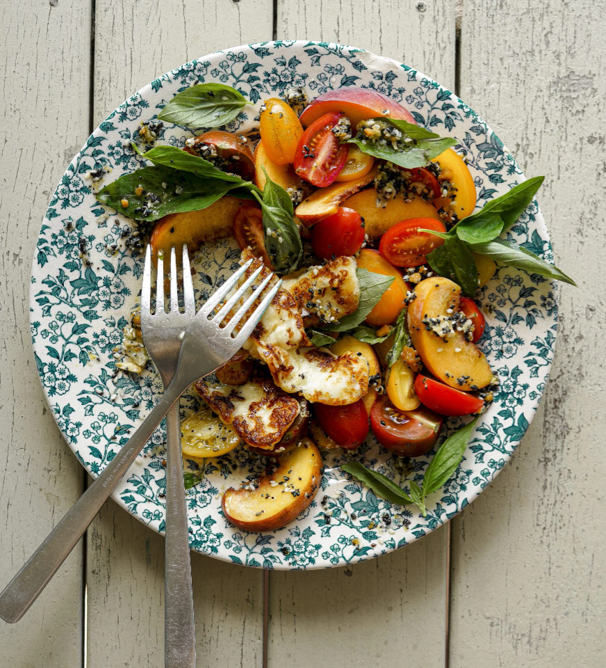 Peach, Tomato, Basil and Halloumi Salad with bagel seasoning dressing