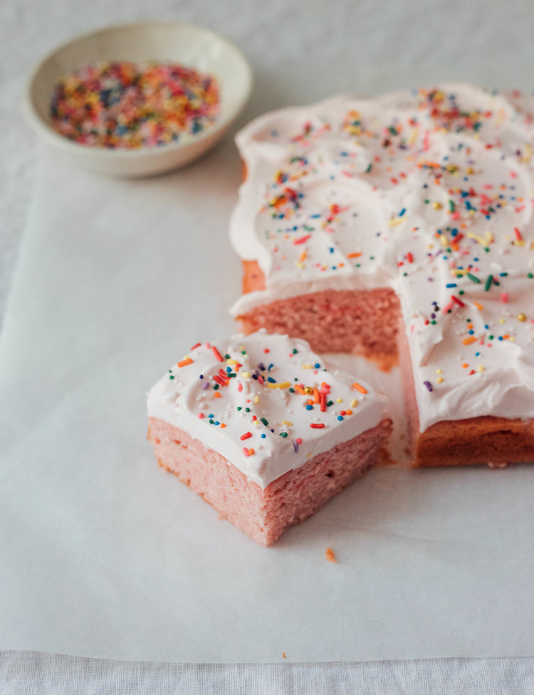 Preheat oven at 350 degrees F and grease a 13×9-inch baking pan. Line with parchment paper and set aside. In a medium bowl, add the flour, baking powder and salt. Whisk until combined. Set aside. In a large bowl, combine sugar and butter and beat until light and fluffy with a hand mixer. In a small bowl, combine in the milk, egg whites, vanilla extract and 1/2 cup rhubarb puree and whisk until combined. Add the dry ingredients into the butter and sugar mixture, in parts. Slowly add in milk/egg/rhubarb mixture and continue stirring until combined. Pour the batter into the prepared baking pan and transfer to the oven to bake for 25 minutes, until a knife inserted into the center comes out clean. Allow the cake to cool to room temperature. Top with Crème Fraiche Frosting and sprinkles!
