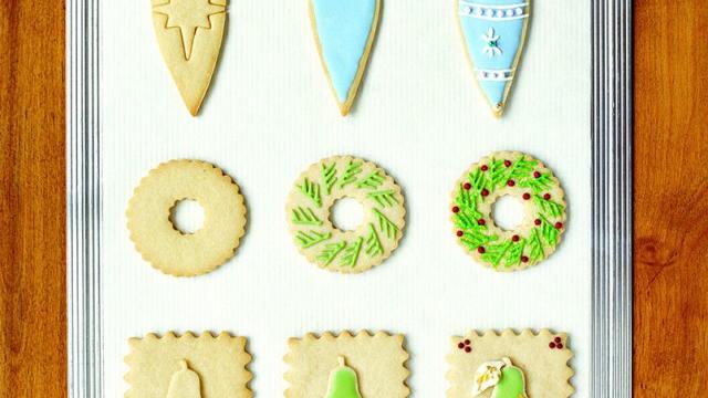 Everything you need to make holiday treats: You don’t need many tools to make our Christmas cookies―just cookie cutters, a pastry bag, a straw, a small spatula, and some ribbon. You’ll find the following decorative sugars and candies at gourmet specialty markets, but you can also make substitutions: Use granulated sugar instead of sanding sugar, and swap in cinnamon Red Hots or nonpareils for the dragées.