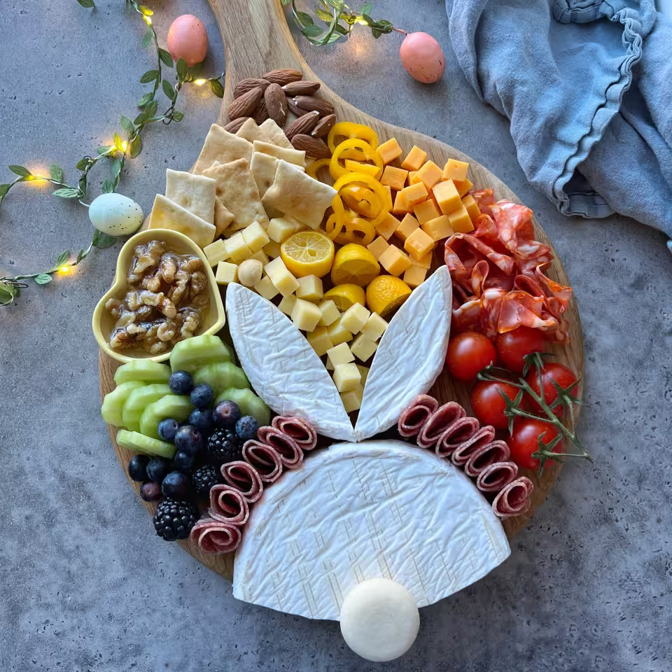 Arrange the Brie at the base of your chopping or charcuterie board, letting about a third extend outside the edge. Cut the cheese along the edge of the board, creating a curved piece. Use this to shape bunny ears. Then, place them on top of the Brie wheel. Spoon the honey into a small bowl. Roll the salami and stack the pieces on top of each other. Arrange the meat around the Brie bunny. Next, arrange the ingredients around the bunny. Add the Babybel tail on top of the Brie cheese wheel, and enjoy!